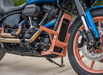Kodlin Engine Guards for M8 Softails with mid-controls come in bronze or black finishes (K59514 / K59515). They are easy to customize at the local powder coater near you.