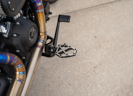 The prototype of the foot peg of the all new Kodlin NXL line was used on this built (K73255). It comes with a black CNC machined aluminum base with a brushed stainless steel top cover. Ultra light with enhanced foot traction and very customizable.